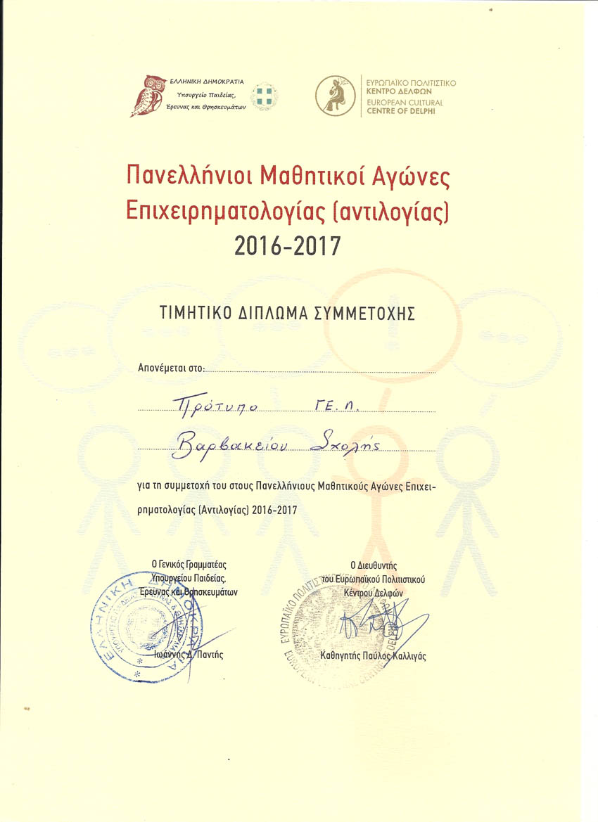 Οι παρακάτω μαθητές συμμετείχαν στου Πανελλήνιους Μαθητικούς Αγώνες Επιχειρηματολογίας (Αντιλογίας) 2016-2017